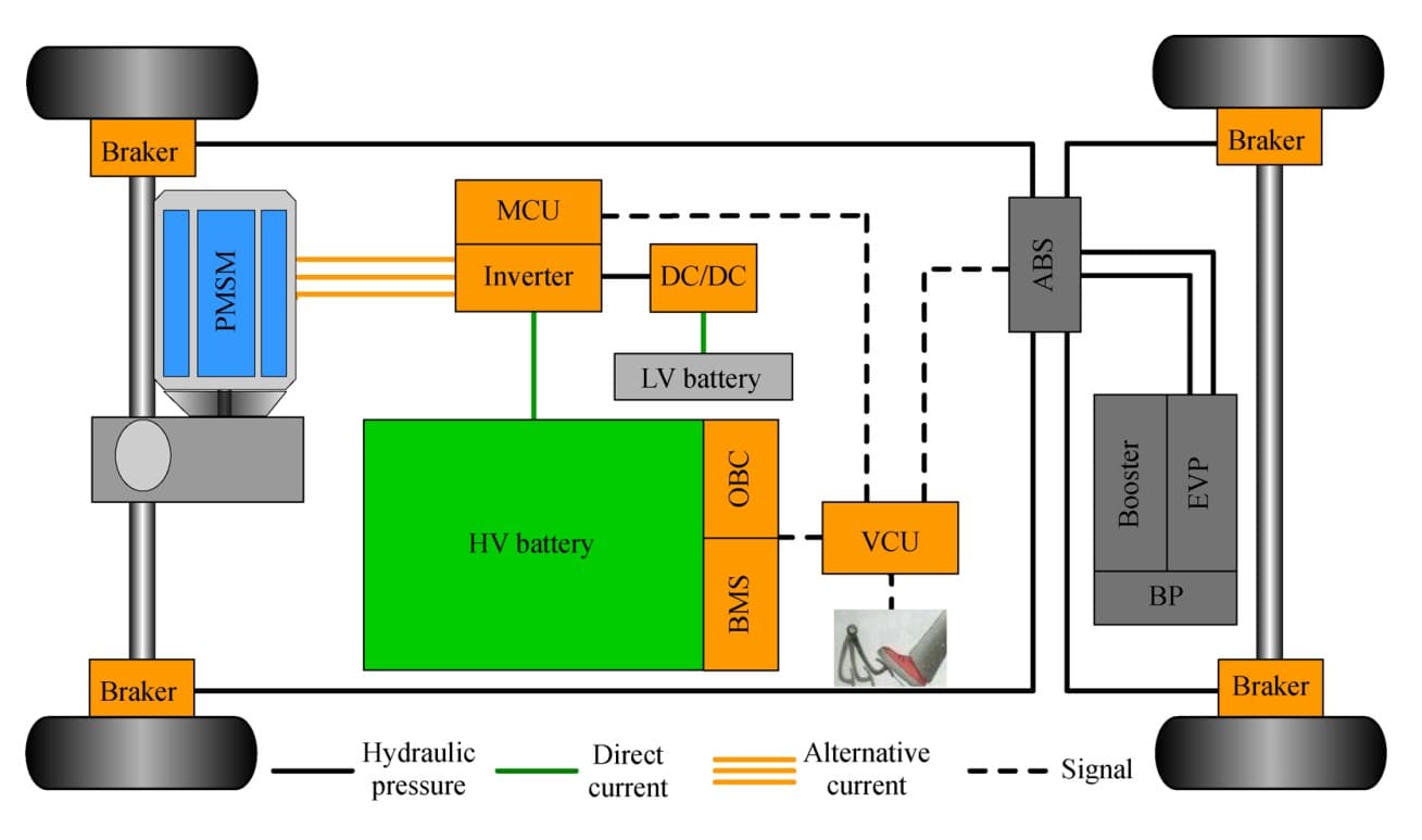 1. Phanh Ma Sát Truyền Thống: Trên xe thông thường, khi bạn đạp phanh, một hệ thống thủy lực sẽ ép các má phanh (pads) kẹp chặt vào các đĩa phanh (rotors) đang quay cùng bánh xe. Ma sát sinh ra sẽ làm chậm chiếc xe lại. Toàn bộ động năng của xe (KE=21​mv2, với m là khối lượng và v là vận tốc) được chuyển hóa thành nhiệt năng và tiêu tán ra môi trường. Đây là một sự lãng phí không hề nhẹ.