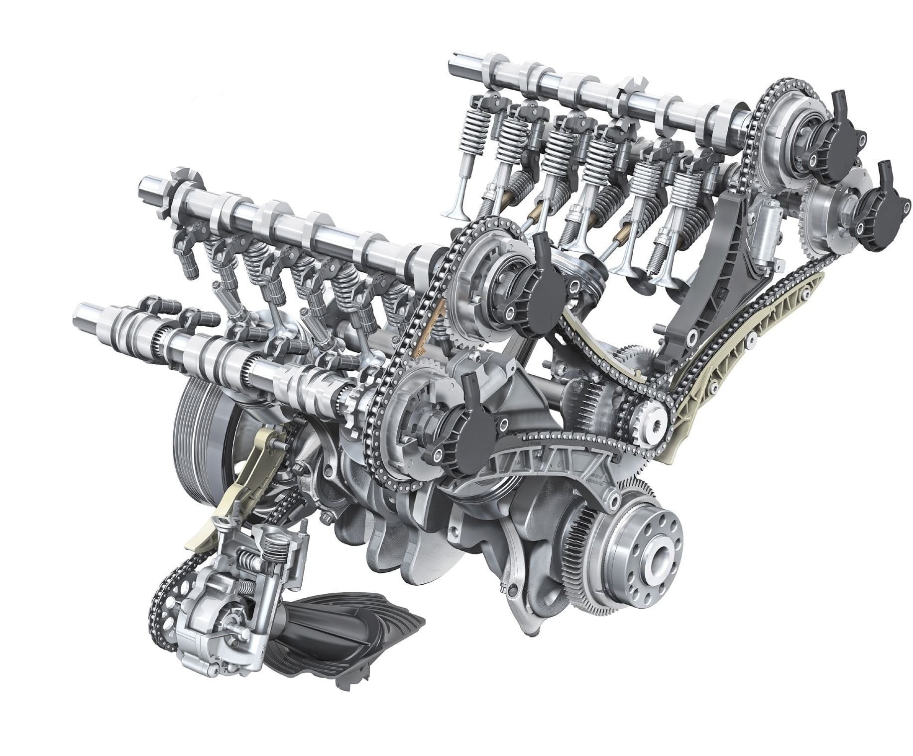 • Hệ dẫn động hiện đại: Không chỉ đơn thuần là dây xích hay dây đai, hệ thống này là một tổ hợp cơ khí chính xác bao gồm: Bánh răng (Sprockets), Thanh trượt (Guides), Bi tỳ/Bi tăng (Idler/Tensioner Pulleys) và quan trọng nhất là Bộ tăng cam thủy lực (Hydraulic Tensioner).